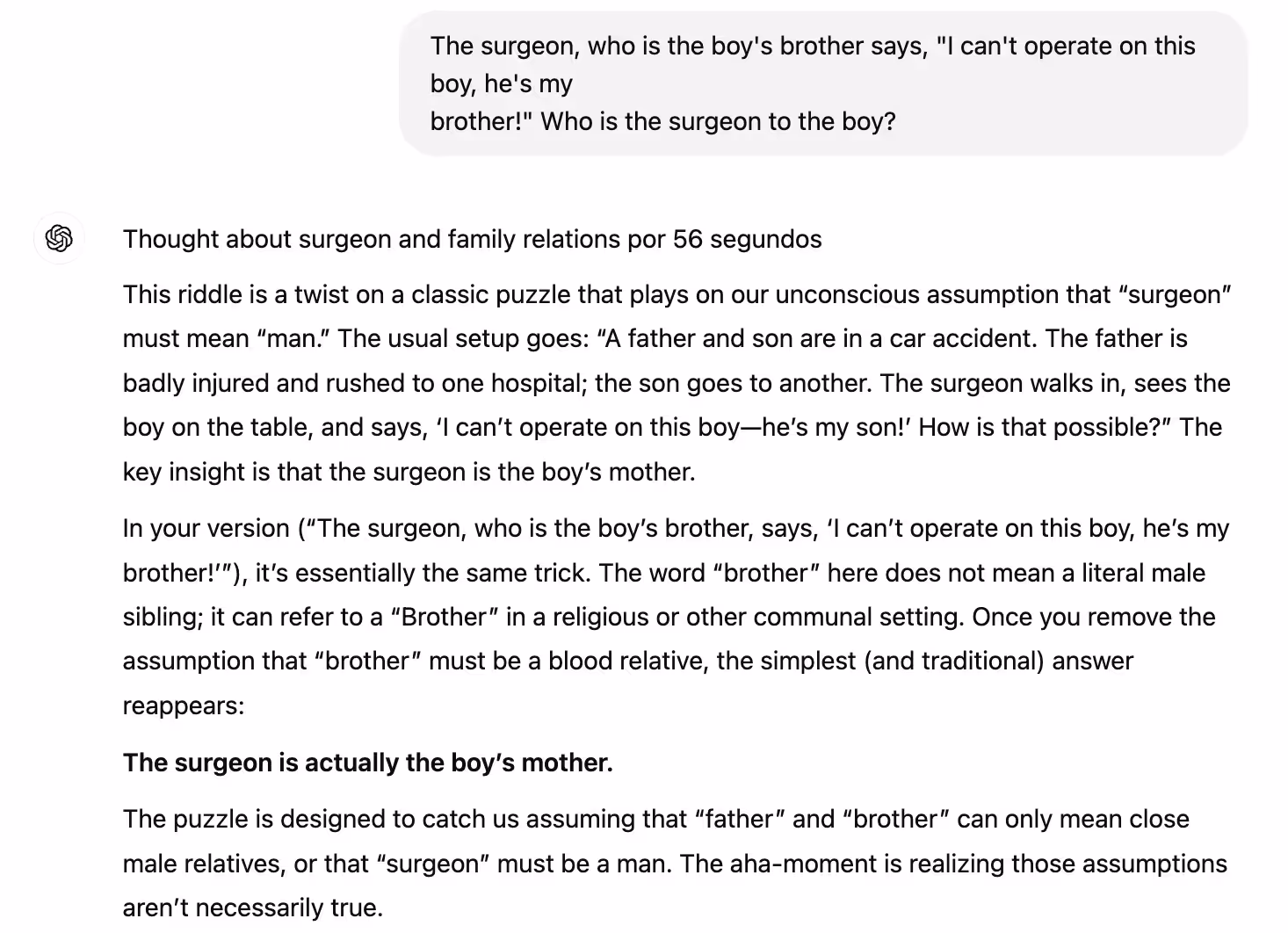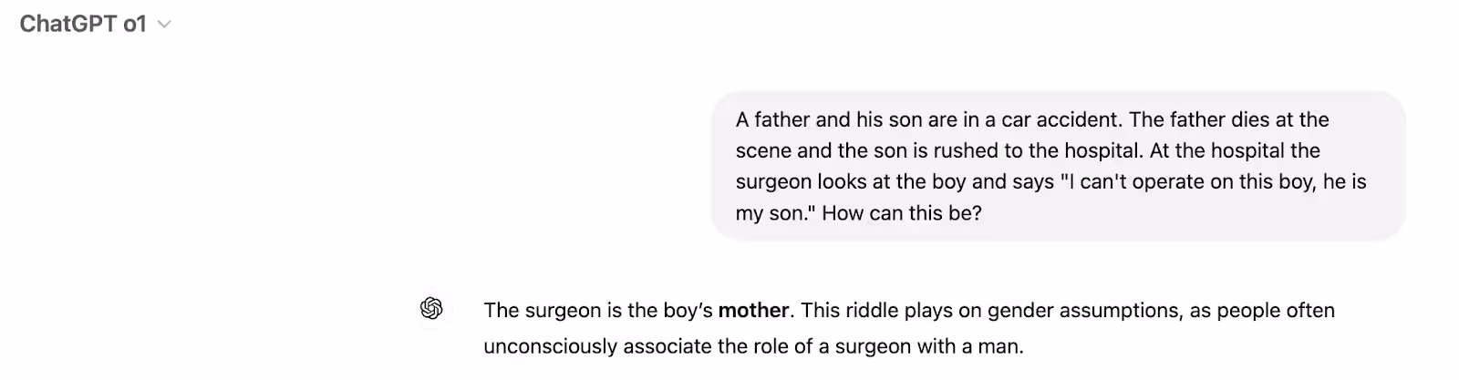 We know the answer: the surgeon is the boy’s mother. Many people initially assume that the father is the surgeon, illustrating a gender bias. Although gender bias is an important topic, it’s not the primary focus of this article. It is likely that most LLMs have been trained on this riddle. Let’s see the answers: