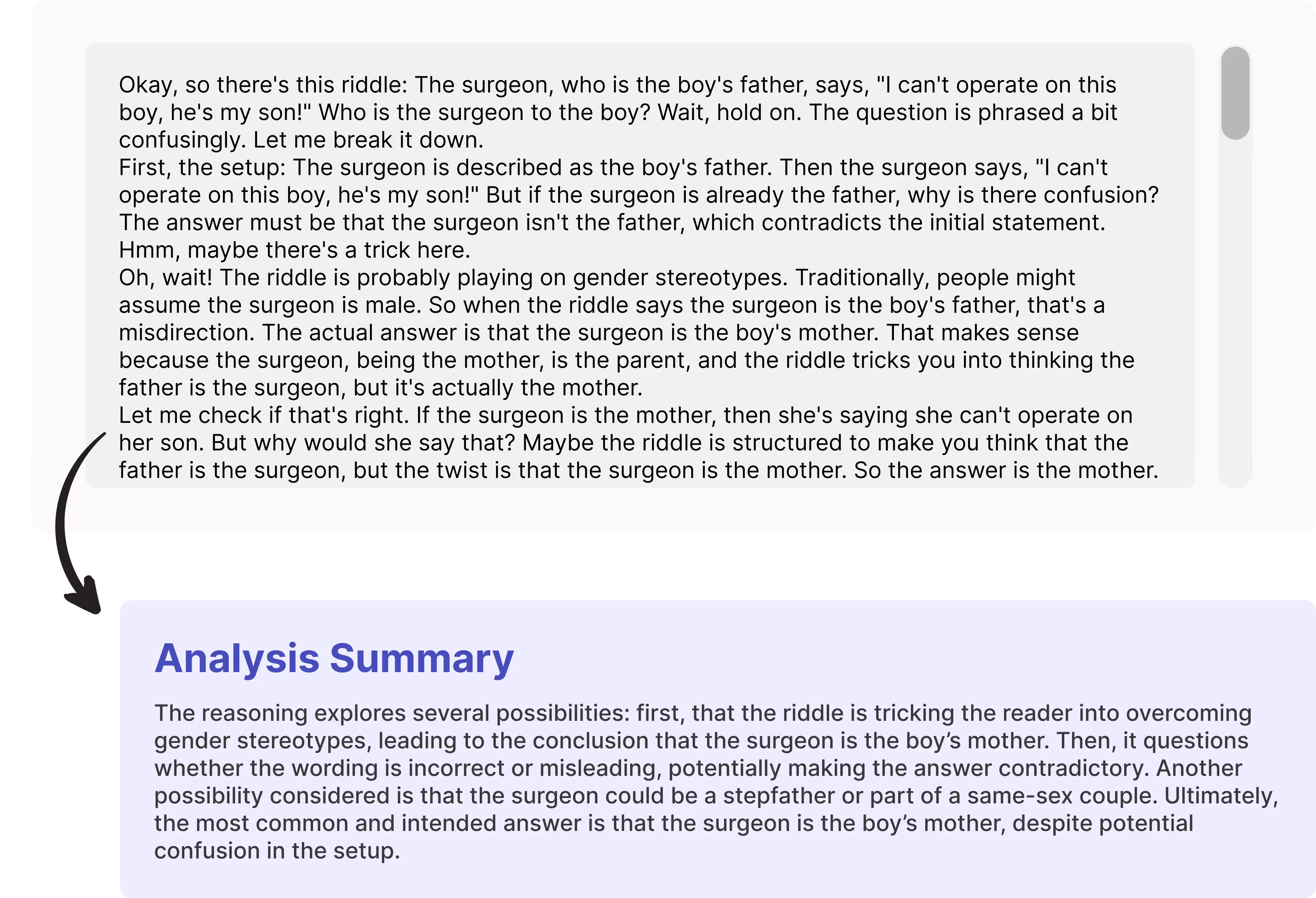 By analyzing DeepSeek’s generated text history, we see it considers correct (brother) and incorrect (mother, sister) hypotheses, mixing them before reaching the final answer. Even then, the final answer often reverts to patterns from the original riddle when generating a concise response.