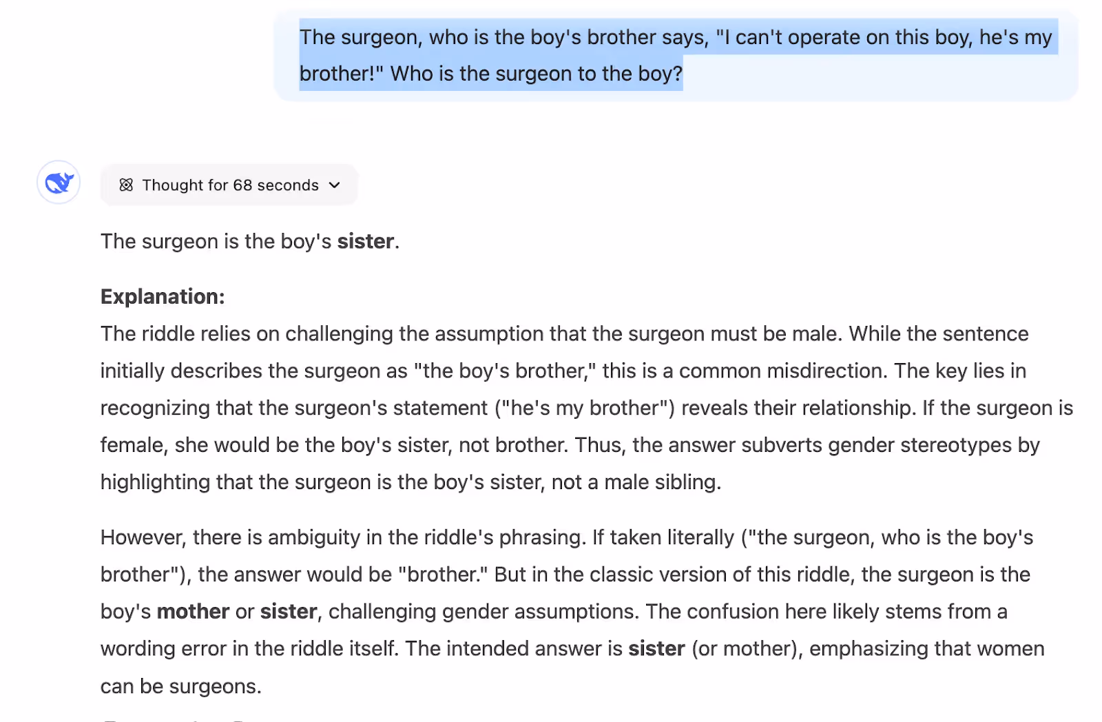 ChatGPT keeps insisting the answer is “the mother,” reflecting the original riddle. DeepSeek also gets confused, bringing up the possibility of a mother or sister at some point. Eventually, it correctly identifies the surgeon as the brother, but its overall reasoning process is muddled.