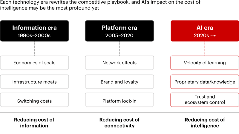 This shift has strategic consequences. When the marginal cost of intelligence collapses, the foundations of competitive advantage begin to move. Historically, advantage accrued to scale, network effects, switching costs, and capital intensity. In the AI era, intelligence becomes widely accessible infrastructure. As that happens, those traditional moats weaken.