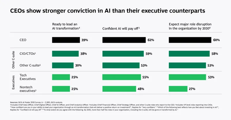 AI is no longer treated as speculative innovation spend. According to Boston Consulting Group’s AI Radar 2026 survey of more than 2,300 executives (including 640 CEOs), artificial intelligence is being institutionalized as a CEO-owned growth priority.