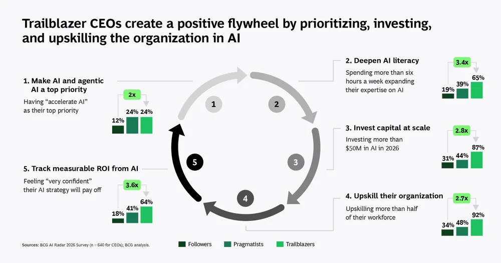 BCG’s segmentation of CEOs highlights a widening performance gap. Trailblazers—roughly 15% of leaders—are embedding AI deeply across workflows, aggressively upskilling their workforce, and prioritizing agentic AI. These organizations report measurable gains in productivity, decision speed, and quality, reinforcing a virtuous cycle of confidence and adoption.