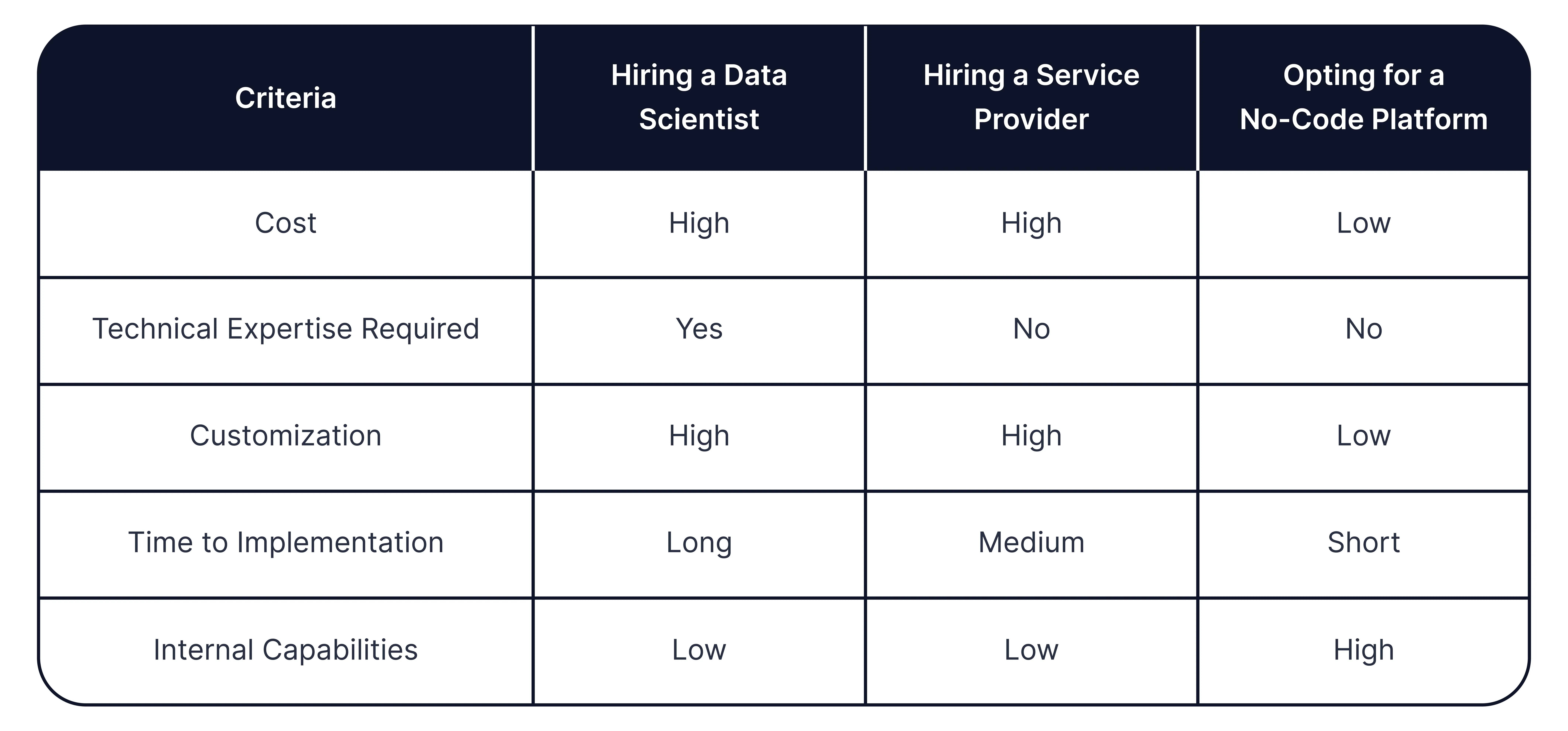 - Cost-Effective: No-code platforms can be significantly less expensive than hiring a data scientist or engaging a service provider.