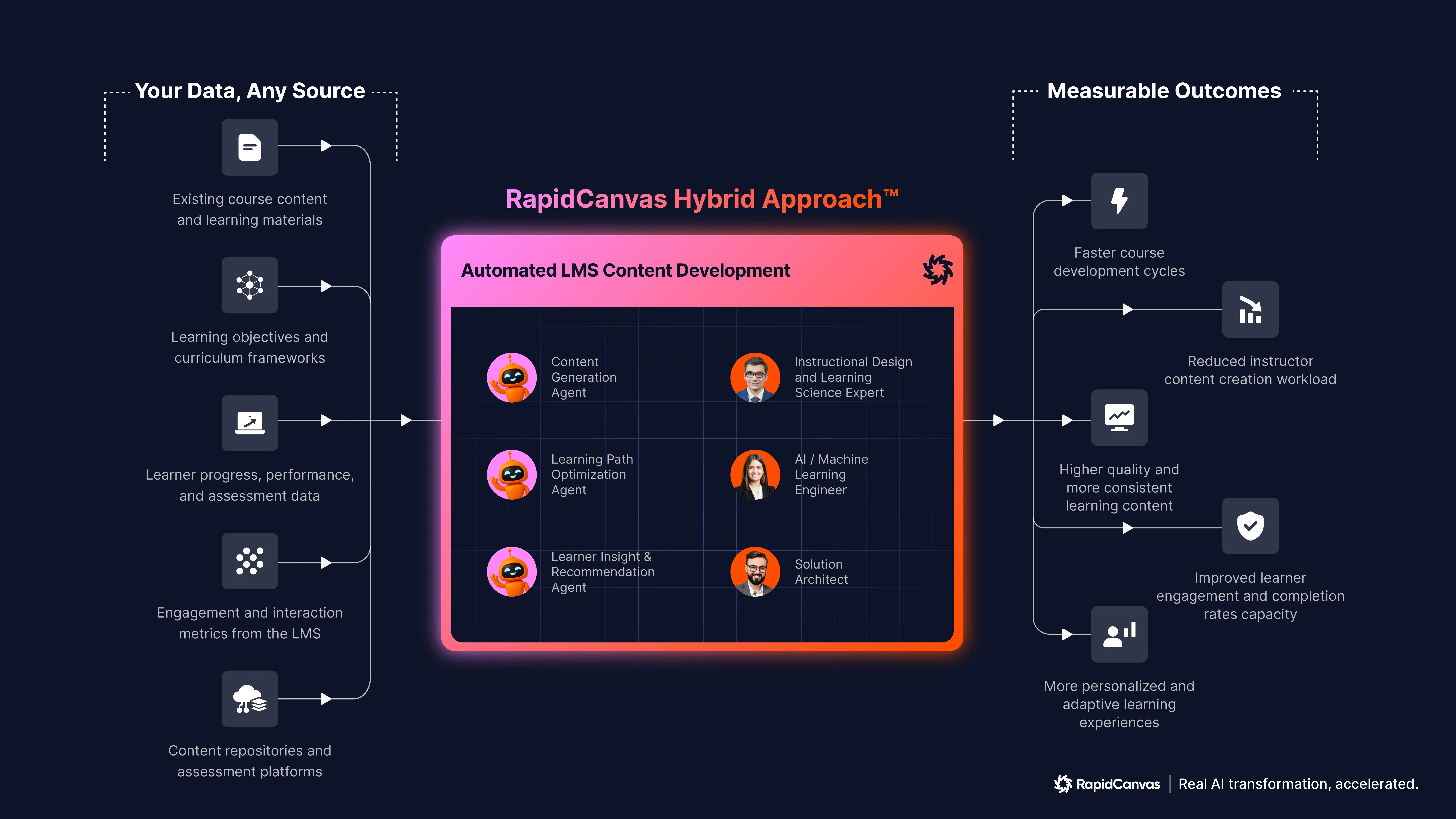 Essential data includes existing course content, learning objectives, assessment history, and student performance records. Real-time inputs such as engagement metrics, progress tracking, and assessment results enhance personalization capabilities. RapidCanvas works with your team during implementation to assess data availability, integrate necessary sources, and establish data quality standards for optimal system performance.