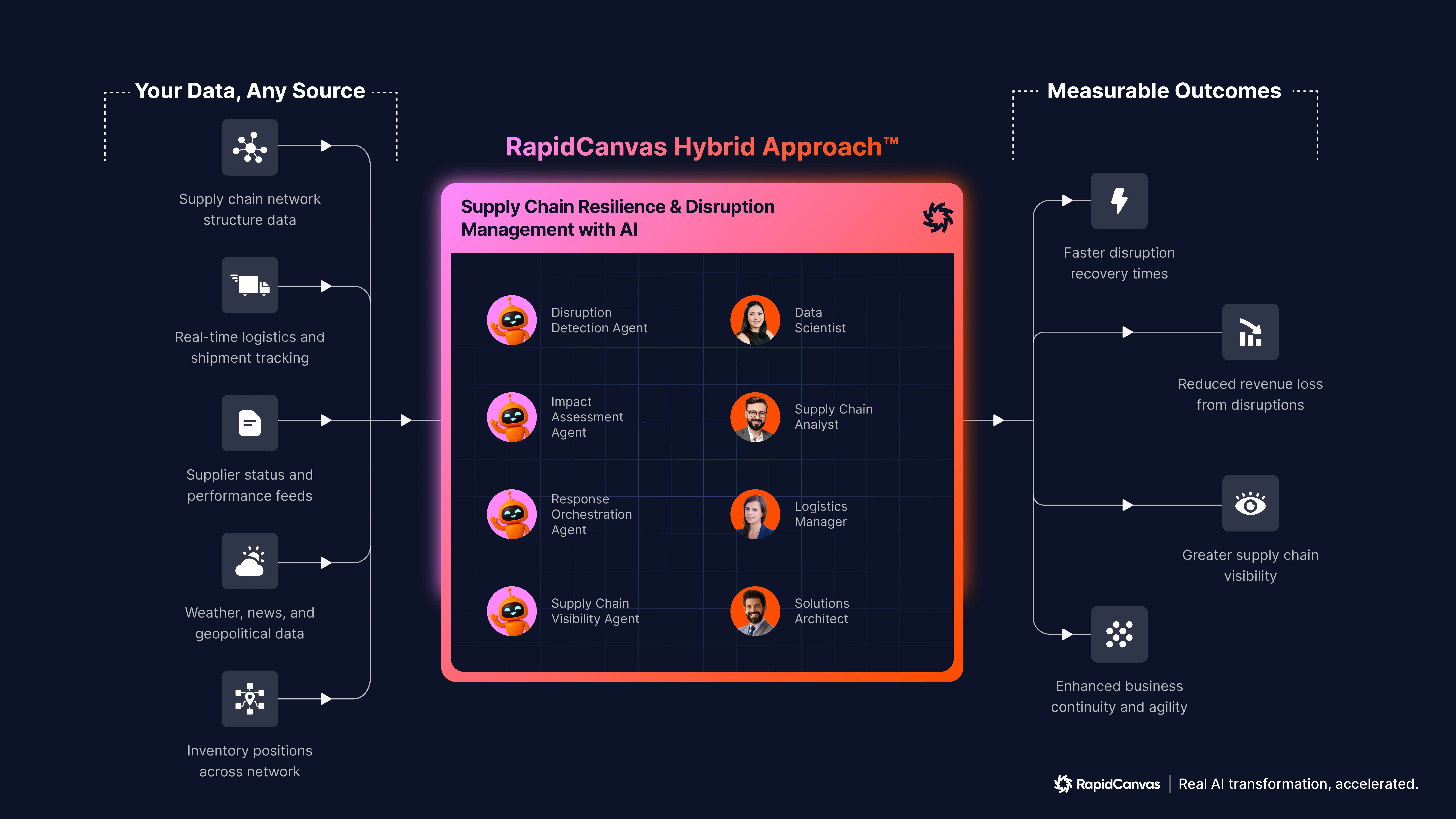 Yes, RapidCanvas integrates with supply chain planning systems, transportation management systems (TMS), warehouse management systems (WMS), ERP platforms, supplier portals, and logistics tracking systems. Our solution accesses real-time data about inventory positions, shipment status, production schedules, and supplier performance. The system also connects to external data sources including weather services, news feeds, port data, flight tracking, and geopolitical risk databases. Integration enhances your existing supply chain visibility and control tower capabilities without replacing current systems.