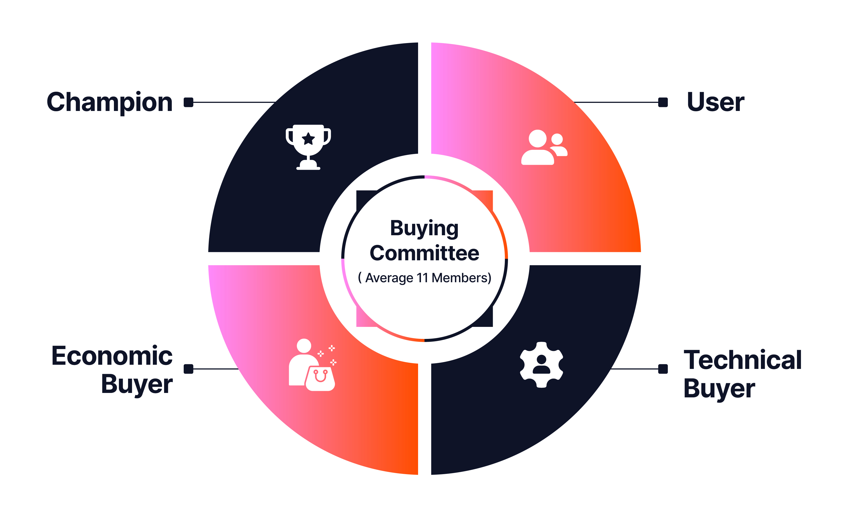 Enterprise deals now involve an average of 11 stakeholders, according to recent data from Gartner. Each stakeholder has different priorities, concerns, and evaluation criteria. Buyers often have one or more potentially competing criteria for a sales decision, ranging from platform champions to users, technical buyers, and economic buyers.