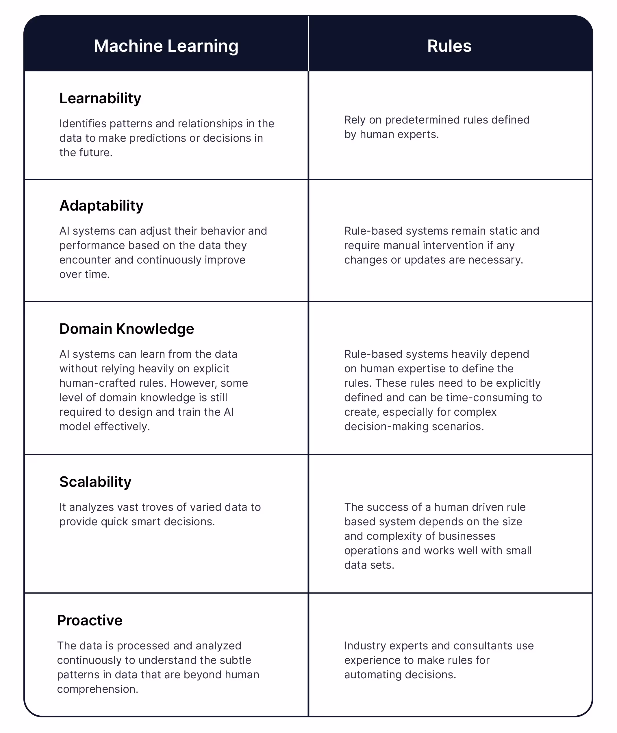 - If the decision-making process is well-defined, and interpretability and control are crucial, the rule-based approach might be more suitable.